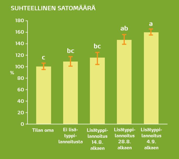 Kaikilla koejäsenillä on sama peruslannoitus. Kolme koejäsentä saivat lisälannoituksena typpeä 11,6 kg/ha eli 75 kg/ha YaraTera Calcinit -lannoitetta. Koe osoittaa, että lisätyppilannoitus kannattaa ja siitä saadaan paras hyöty, kun se tehdään myöhäisempänä ajankohtana.
