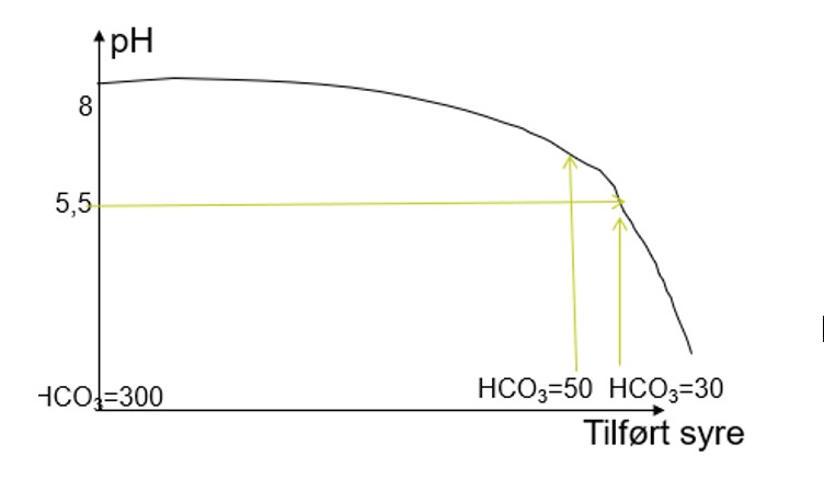 När bikarbonat neutraliseras med syra, sjunker pH till en början mycket långsamt i förhållande till mängden syra som tillsätts. När bikarbonathalten närmar sig den eftersträvade halten 30–40 mg/l försnabbas sänkningen av pH, såsom bild 1 visar. Av den orsaken bör man vara försiktig med att tillsätta syra, och rekommenderad mängd får inte överskridas.