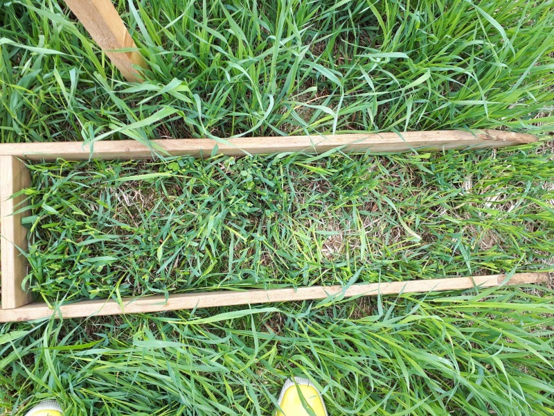 Härmässä puna-apilalla täydennyskylvetty timotei–nurminata–ruokonata-nurmiseos on lähtenyt hyvin kasvuun. Kuiva-ainesatoa on kertynyt yli 1100 kg ka/ha, vaikka kasvusto ei ole aivan täystiheää. Kuvassa olevan kasvuston tiheydeksi arvioitiin 70 %.