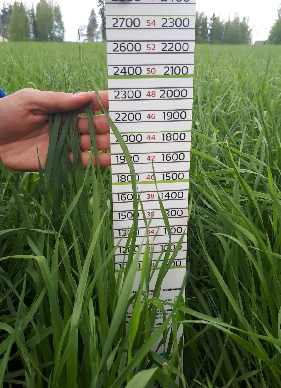 Riihipellon lohkolta korjattiin 13. kesäkuuta hyvä ja laadukas reilu 4000 kg ka/ha nurmisato. Kuitua ja raakavalkuaista korjatussa nurmirehussa oli sopivasti, NDF 561 ja raakavalkuainen 137 g/kg ka.
