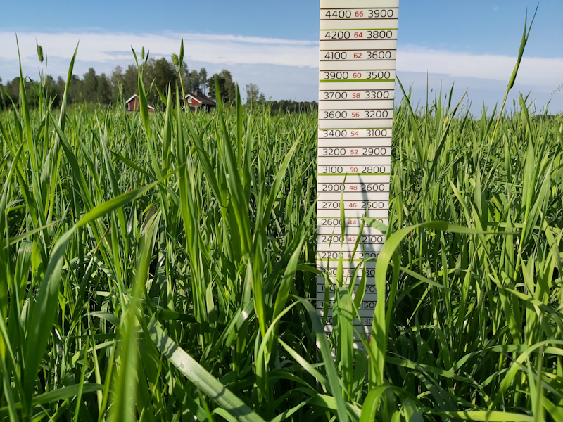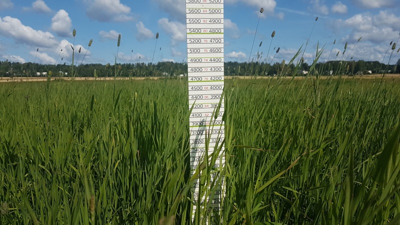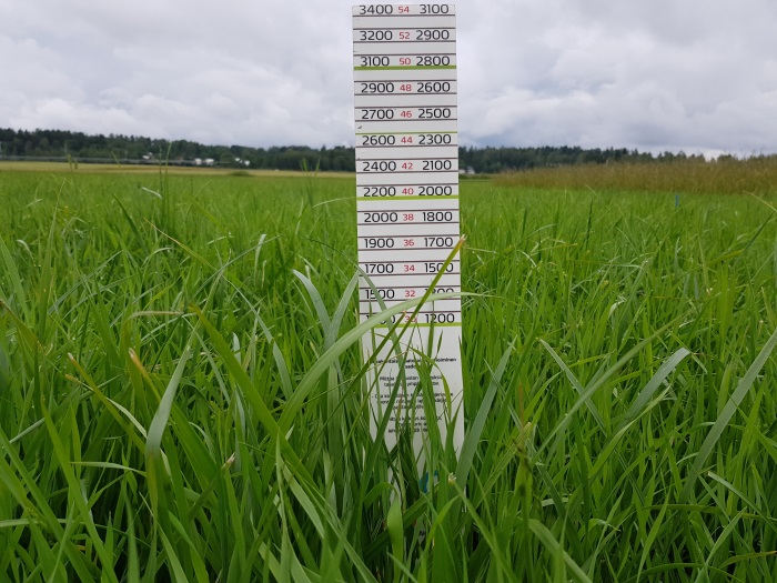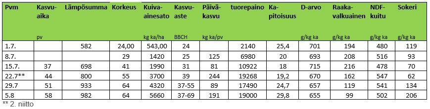 Yara Kotkaniemen tutkimustilalla toinen sato niitettiin tiistaina 22.7. Kuiva-ainesato oli hyvällä 3700 kg ka/ha tasolla. D-arvo toiselle sadolle jäi tasolle 670 g/kg ka ja NDF 547 g kg/ha ka. Kasvusto oli kasvanut hyvin viime viikosta eikä hellejakso ehtinyt pudottaa D-arvoa liiaksi ennen niittoa. Kasvuston korkeus niittohetkellä oli 55 cm. Kasvuasteen määrittäminen on toisella sadolla haastavampaa, ja kasvuasteeksi arvioitiin 33-39.