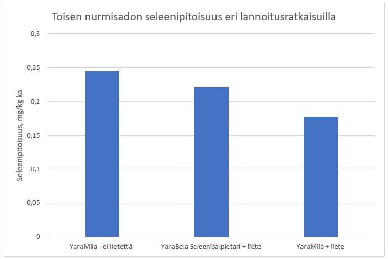 Keskimäärin samansuuruisella lietteen täydennyslannoituksella YaraMila-lannoitteilla saavutettiin hyvä 0,17 mg/kg ka seleenipitoisuus, joka on helppo täydentää rehukivennäisillä.