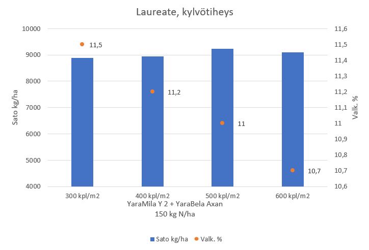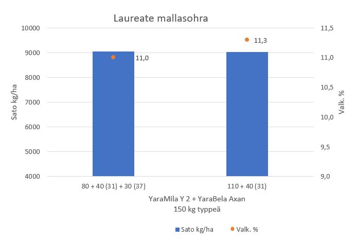 Laureate-ohrasta saatiin Kotkaniemen koetilalla yli 9000 kilon sato sekä kahdessa että kolmessa osassa lannoitettuna. Valkuainen pysyi myös mallasohralta vaaditulta tasolla, kun typpeä käytettiin 150 kiloa hehtaarille.