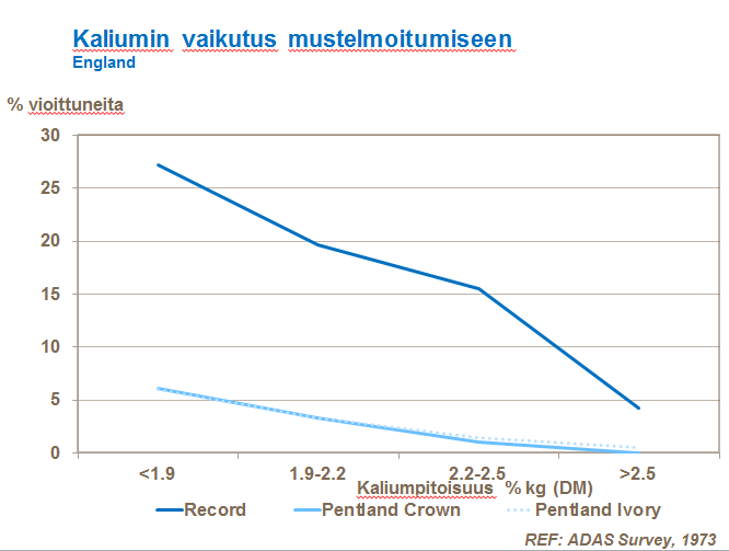 Kaliumin lähde vaikuttaa myös mustelmoitumisen määrään. Kaliumsulfaatti vähentää kaliumsuolaa enemmän mustelmoitumista.