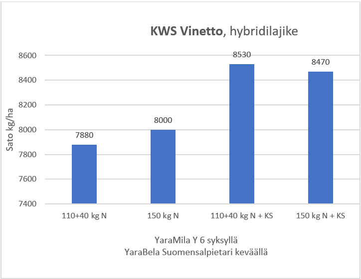 KWS Vineton kasvinsuojelusta saatiin selvää sadonlisää. Moddus EVO -korrensäädettä käytettiin 0,25 l/ha (BBCH 25) ja Elatus Era -tautiainetta 0,6 l/ha (BBCH 39). Keskimäärin sadonlisää kasvinsuojelulla saatiin 560 kg/ha.