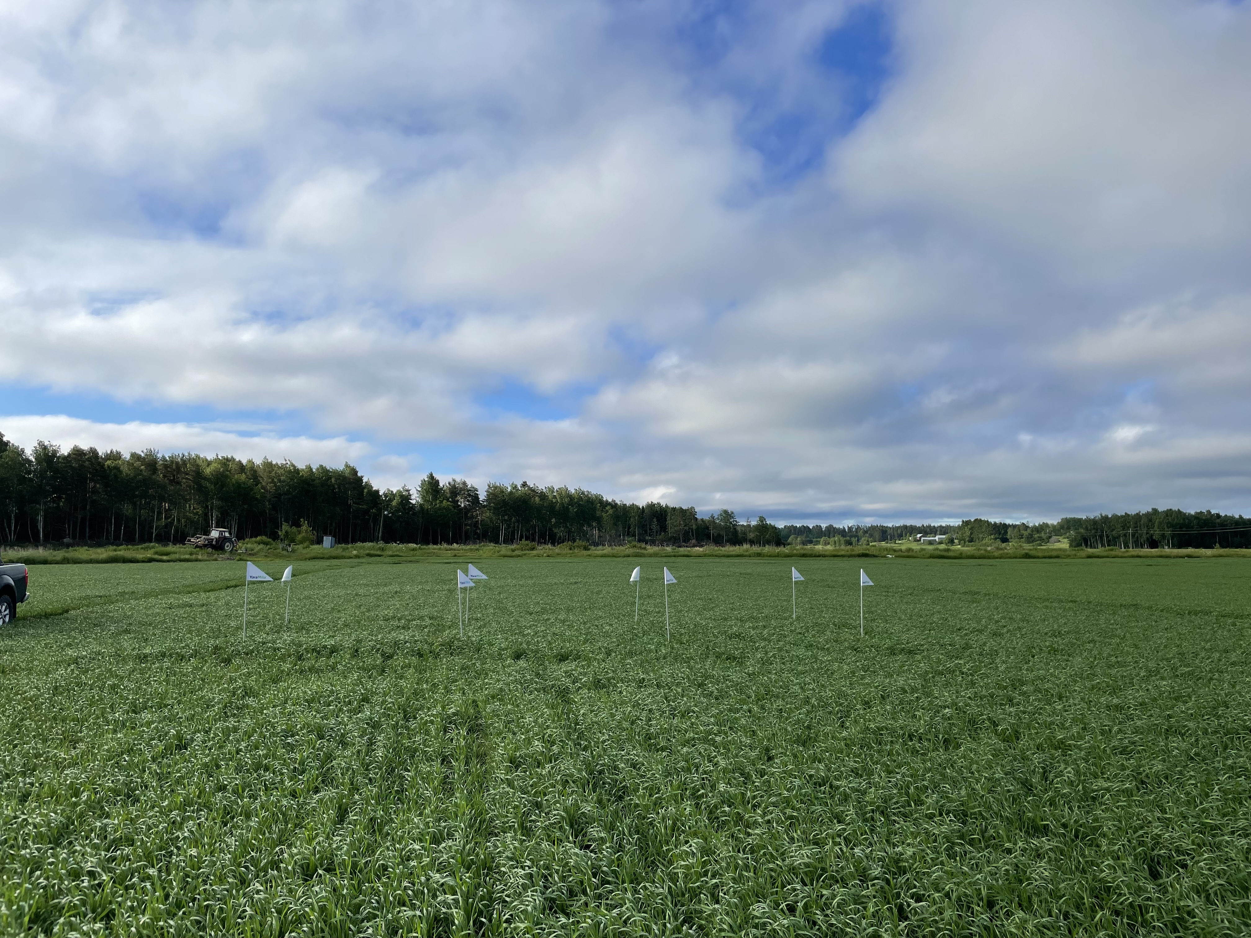 Kevätvehnä Helmi on kasvanut viikon aikana reippaasti. Korrenkasvu on pikapuolin alkamassa, jostain yksilöistä solmuja jo tunnistaa. Pääosin kasvusto kuitenkin pensoo vielä. Talousviljelmältä otettiin Yara Megalab –kasvianalyysi ja tuloksia saadaan ensiviikolla. Nollaruutu alkaa erottumaan typenotossa heikompana muihin ruutuihin nähden. Kasvustoon on tehty ruiskutus mennen viikon aikana Moddus Evo + YaraVita StarPhos MnP:llä 3 l/ha höystettynä. Ruiskutus on tehty kaikille ruuduille. Lisäksi kasvusto on lisälannoitettu 7.6. YaraMila NK 2 -tuotteella 131 kg/ha N 29 kg. Lisälannoitus on tehty muulle alalle, mutta nollaruutu on jätetty ilman eväitä.