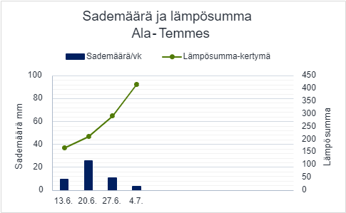 Nyt on saatu sadetta ja se näkyy kasvustossa. Maan kosteus on 34 % ja tehoisaa lämpösummaa on kertynyt 209 astetta. Kasvusto etenee hurjaa vauhtia ja on ottanut typpeä käyttöön tehokkaasti. Sato-odotukset ovat tässä vaiheessa kasvukautta korkealla.