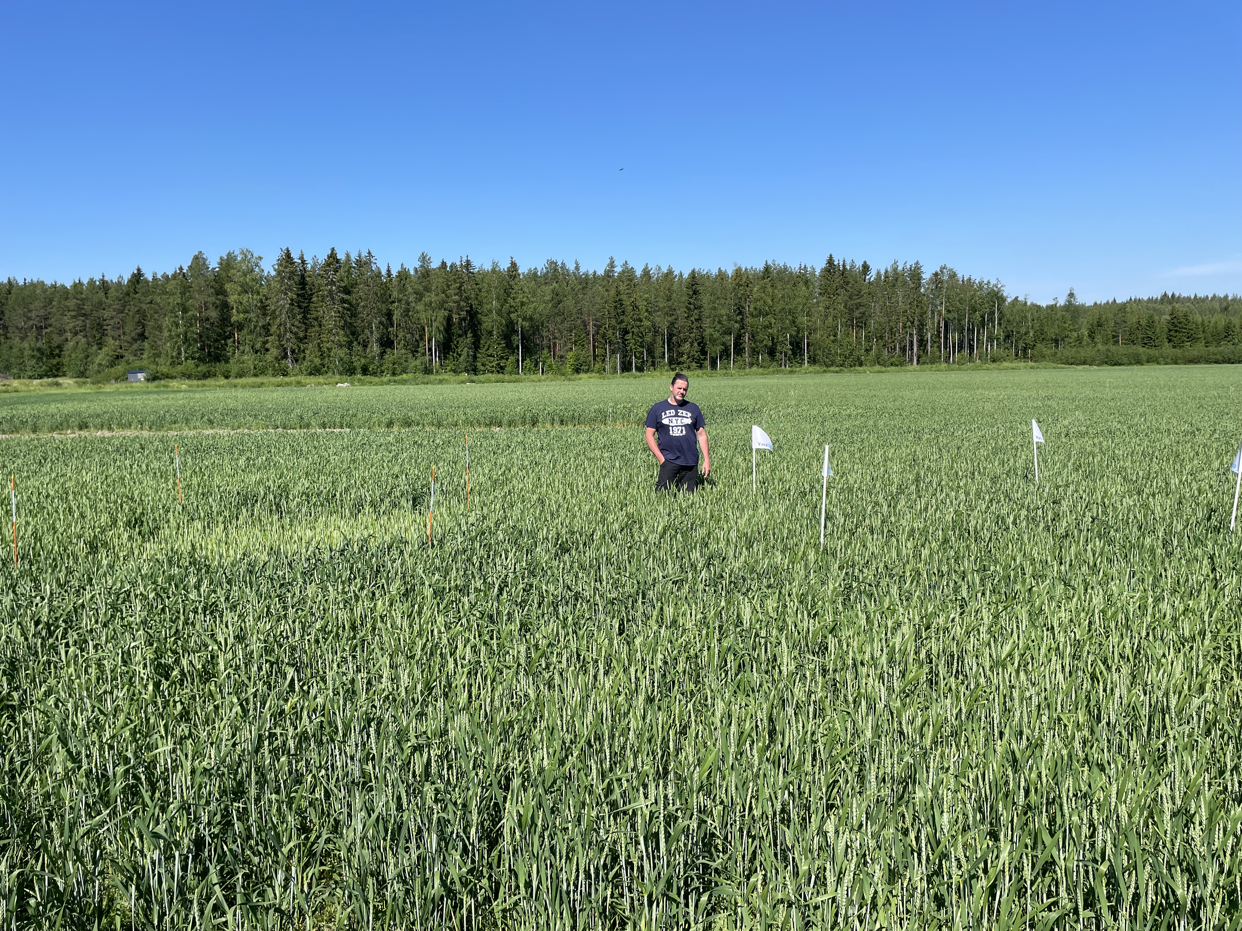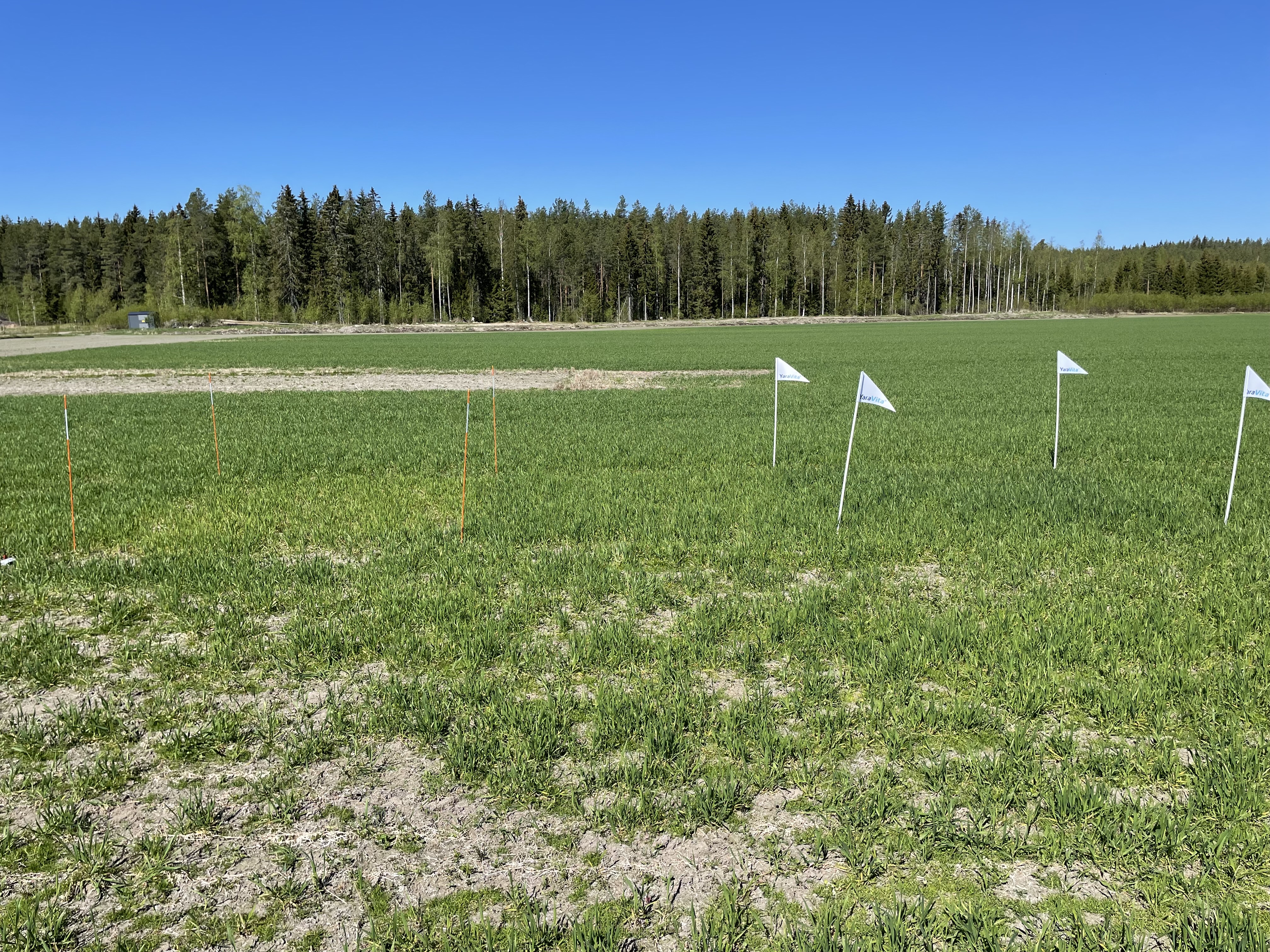 Hienosti menee Ilmajoella! Syysvehnä on todella leveälehtistä ja kasvusto on terveen vihreän näköistä! Nollaruudun typenotto on heikkoa, mutta muut ruudut kehittyvät ja kasvavat silmissä. Typenotto on 14 kg N viikossa. Tähkä on jo tulossa esille ja seuraavaksi seurataan, kuinka monta jyvää olemme onnistuneet samaan tähkään.