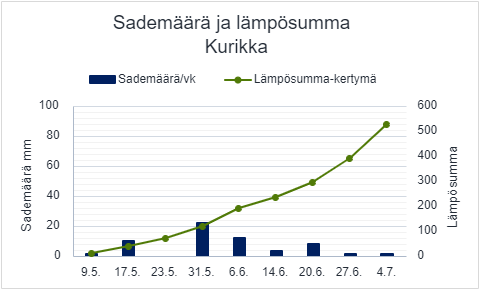 Nyt myös Kurikan havaintoruudun syysvehnät kukkivat. Viikossa lämpösumma on noussut huimasti ja nyt saisi muutama sadekuuro osua myös tänne, jotta jyvät täyttyisivät. Kurikan mittaus jatkuu elokuussa ennen puinteja.