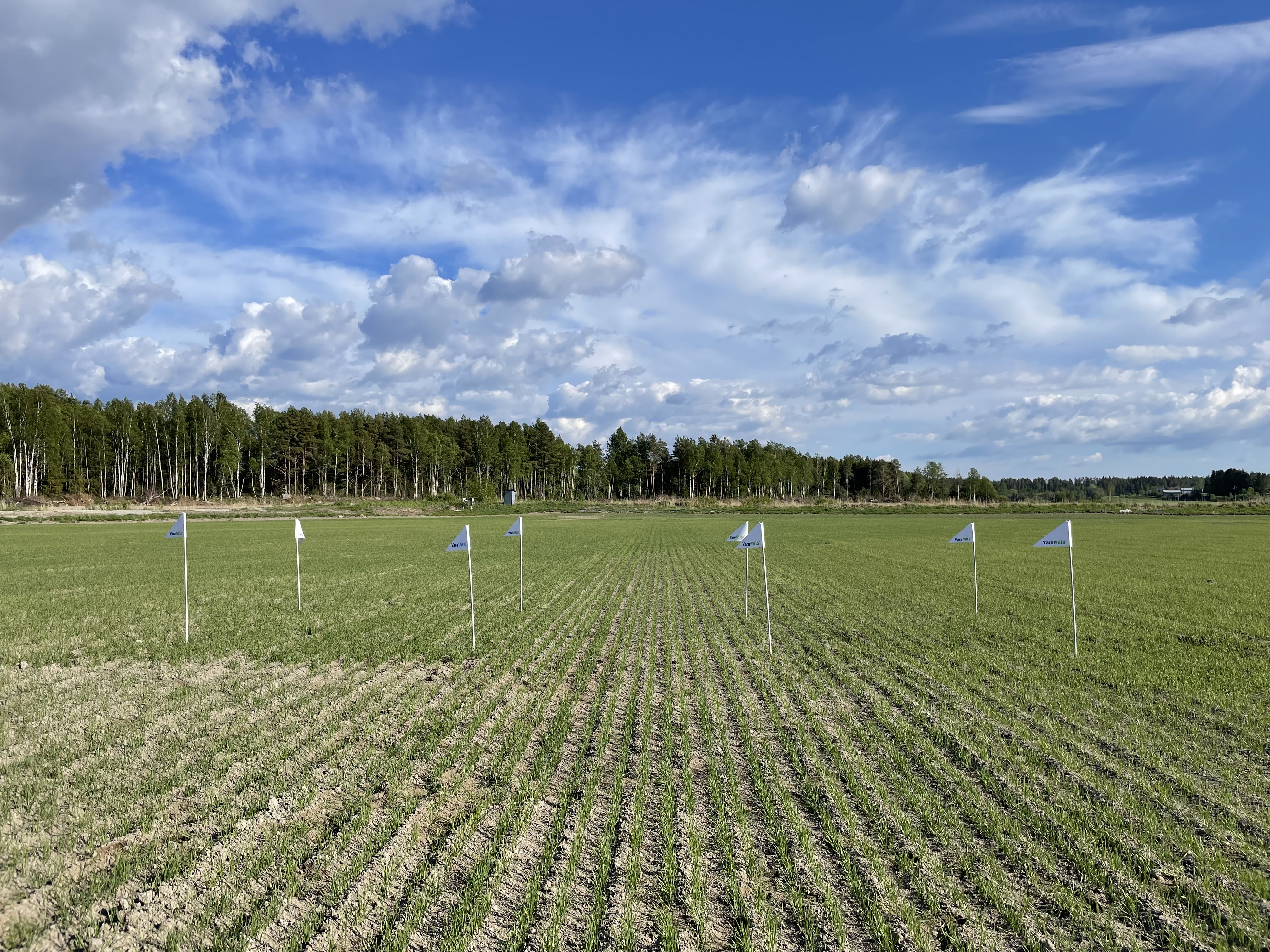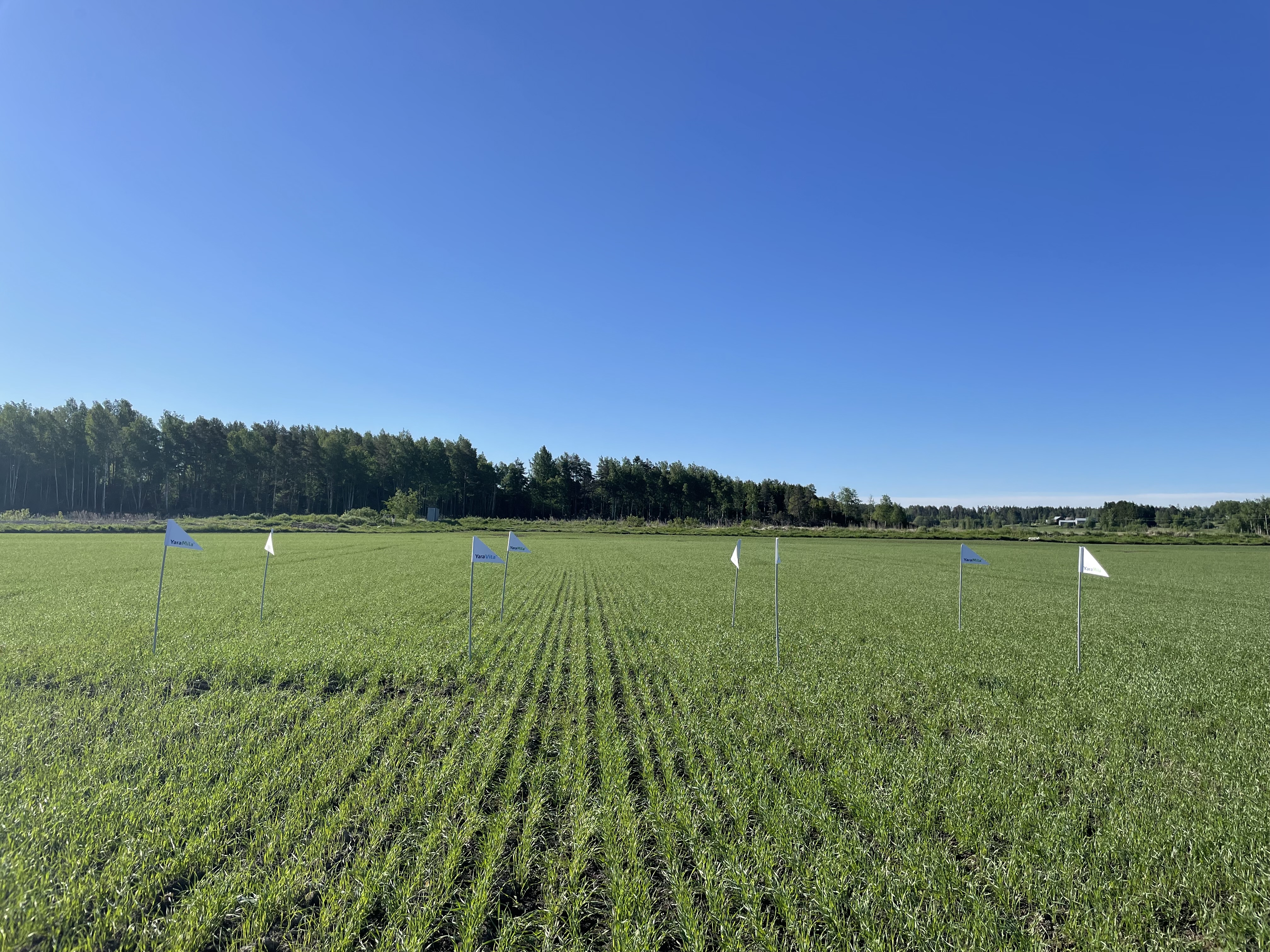 Kevätvehnä Helmi on kasvanut viikon aikana reippaasti. Korrenkasvu on pikapuolin alkamassa, jostain yksilöistä solmuja jo tunnistaa. Pääosin kasvusto kuitenkin pensoo vielä. Talousviljelmältä otettiin Yara Megalab –kasvianalyysi ja tuloksia saadaan ensiviikolla. Nollaruutu alkaa erottumaan typenotossa heikompana muihin ruutuihin nähden. Kasvustoon on tehty ruiskutus mennen viikon aikana Moddus Evo + YaraVita StarPhos MnP:llä 3 l/ha höystettynä. Ruiskutus on tehty kaikille ruuduille. Lisäksi kasvusto on lisälannoitettu 7.6. YaraMila NK 2 -tuotteella 131 kg/ha N 29 kg. Lisälannoitus on tehty muulle alalle, mutta nollaruutu on jätetty ilman eväitä.