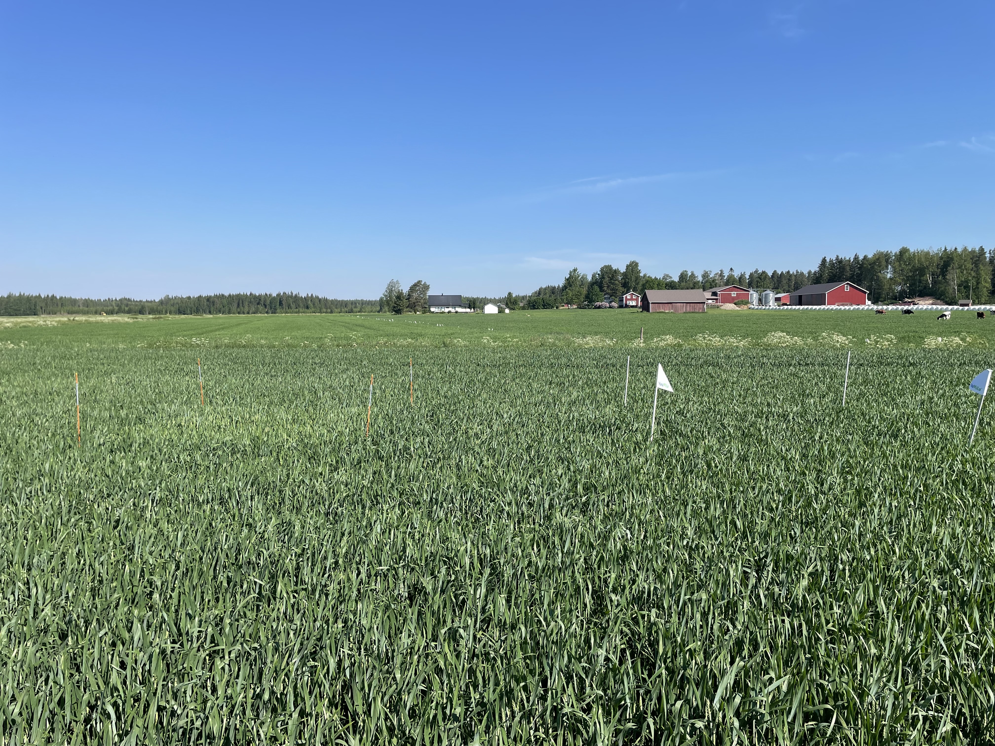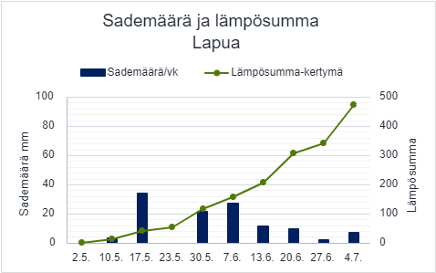 Lämpöä ja kosteutta on sopivasti! Lapuan ruutujen lämpösumma on jo yli 300 astetta ja tähkät ovat tulossa esille. Typenotossa kaikilla tasaista kasvua ja lehdet ovat leveitä sekä hyvän värisiä. Seuraamme innolla, miten pitkiä tähkiä saamme tältä havaintopaikalta!
