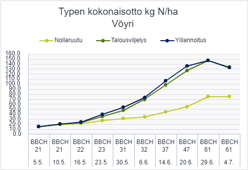 Viikon kasvupyrähdys! Vöyrillä on kasvusto muuttunut huomattavan paljon viikon aikana, kasvuaste on jo 47, joten tähkä on tulossa esille ja lippulehden tuppi on haljennut. Nollaruudun typenotto on nyt 10 kg N, kun taas talousviljelmä sekä ylilannoitusruutu ovat ottaneet lähes 30 kg N viikossa!