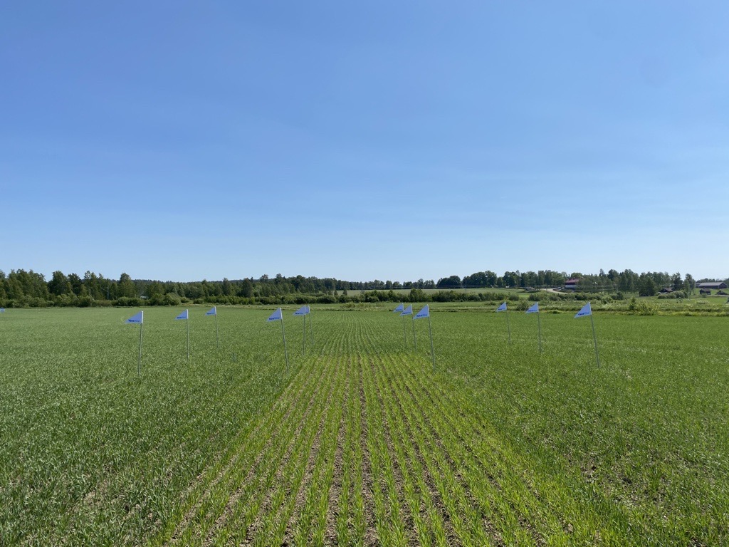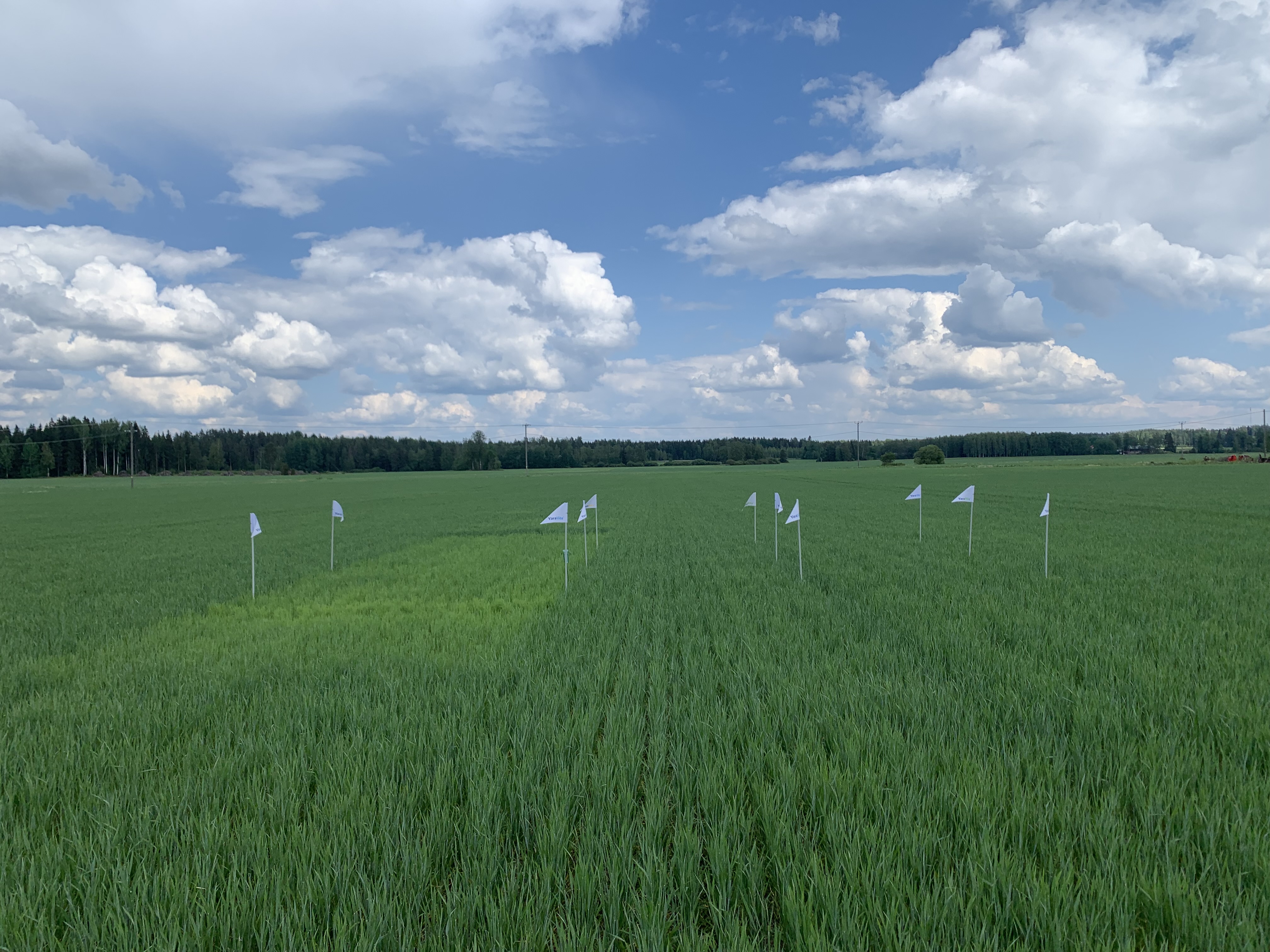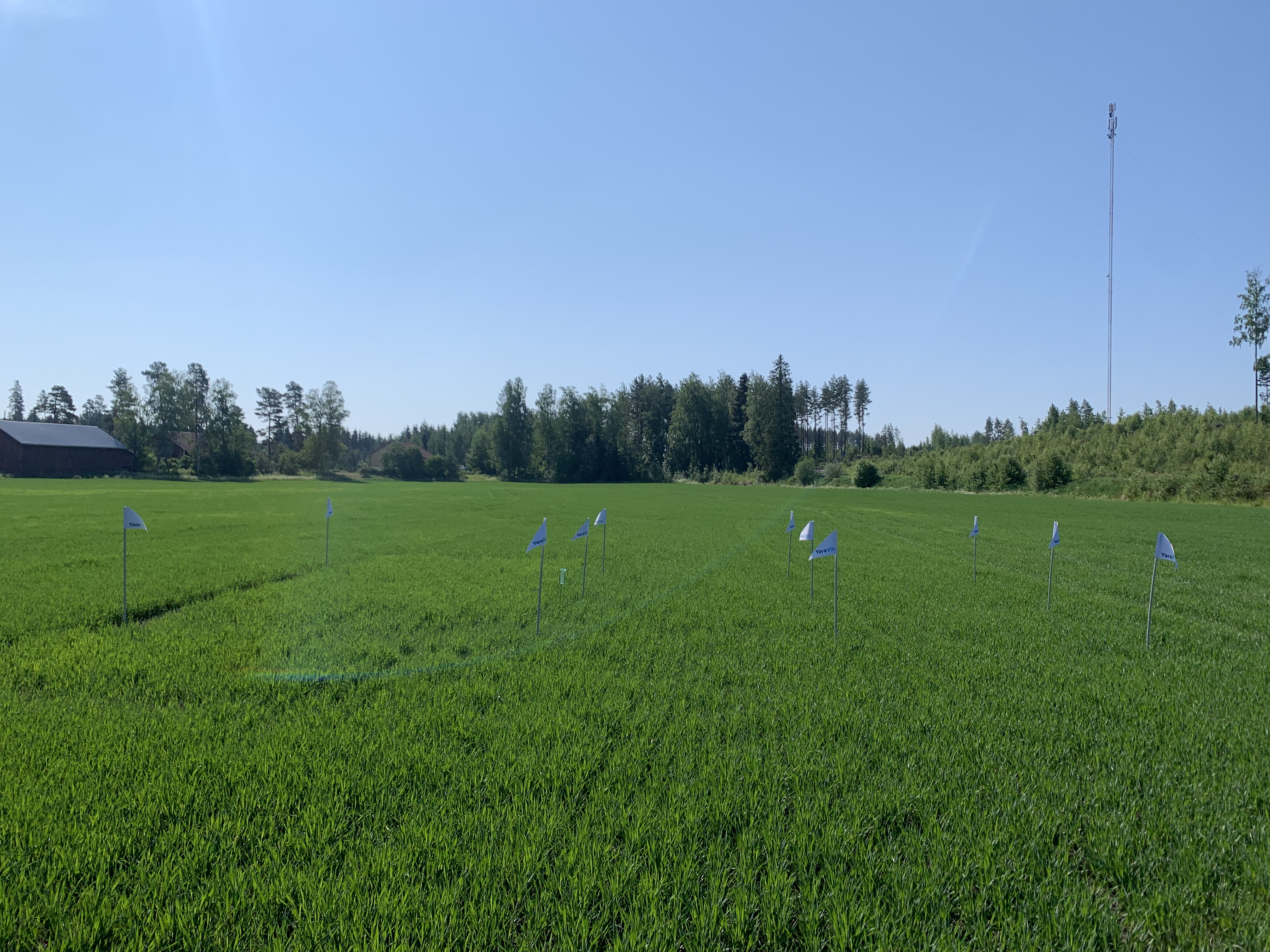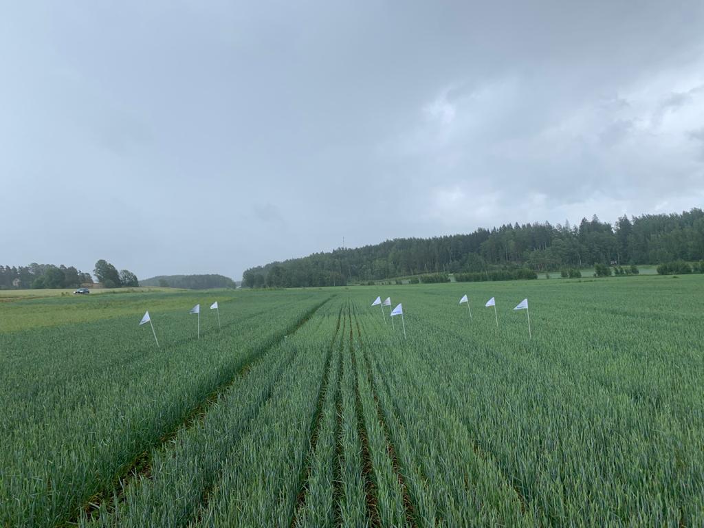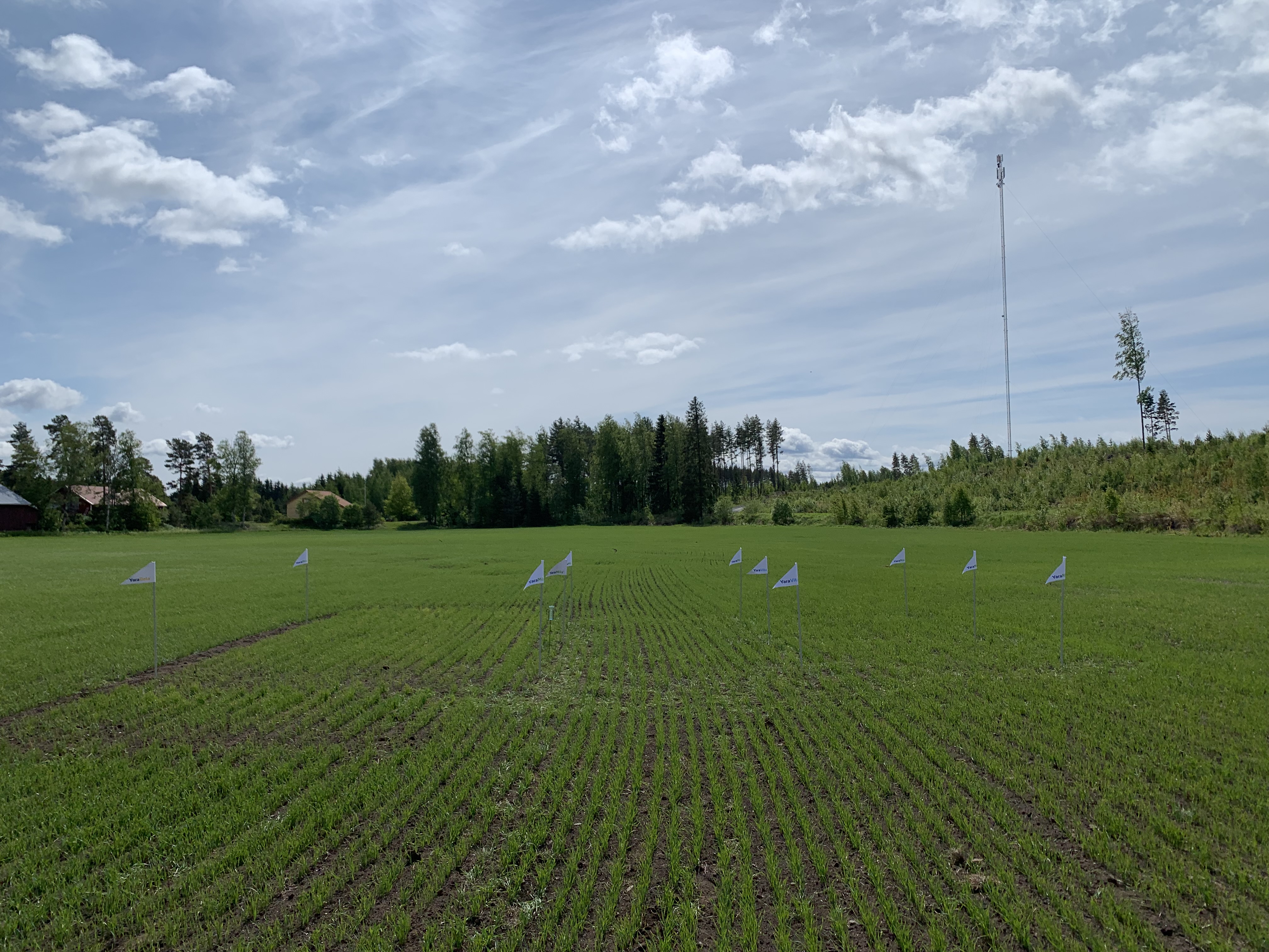 Tammisaaressa odotetaan ja toivotaan vettä. Mittauksen aikana horisontista nousi tummia pilviä ja ukkosen jyrinäkin kuului. Toivottavasti sadepilvet löysivät lohkolle, kun mittaaja ei ehtinyt jäädä tanssimaan sadetanssia kovinkaan pitkään. Kasvusto aivan pensomisen alkuhetkillä. Nollalannoitusruutu lohkolla erottuu selvästi. Kasvuston typenotto on vasta alussa. Kylvöt on täällä suoritettu 14.5. ja kylvölannoituksena on annettu Polar NPK (S) 22-3-10 400kg/ha.