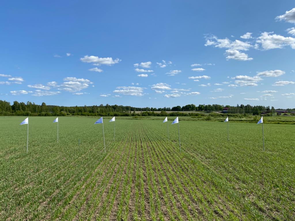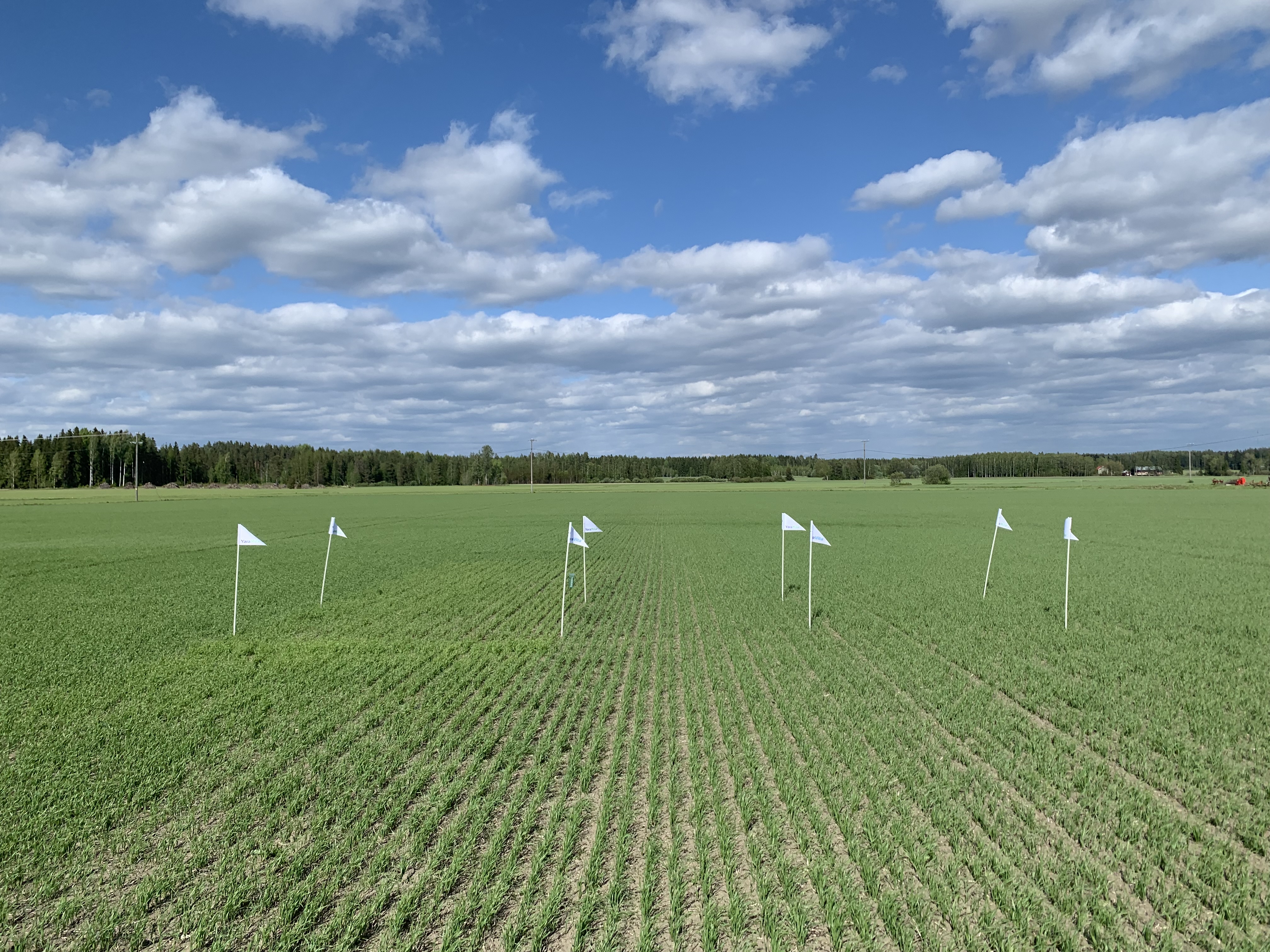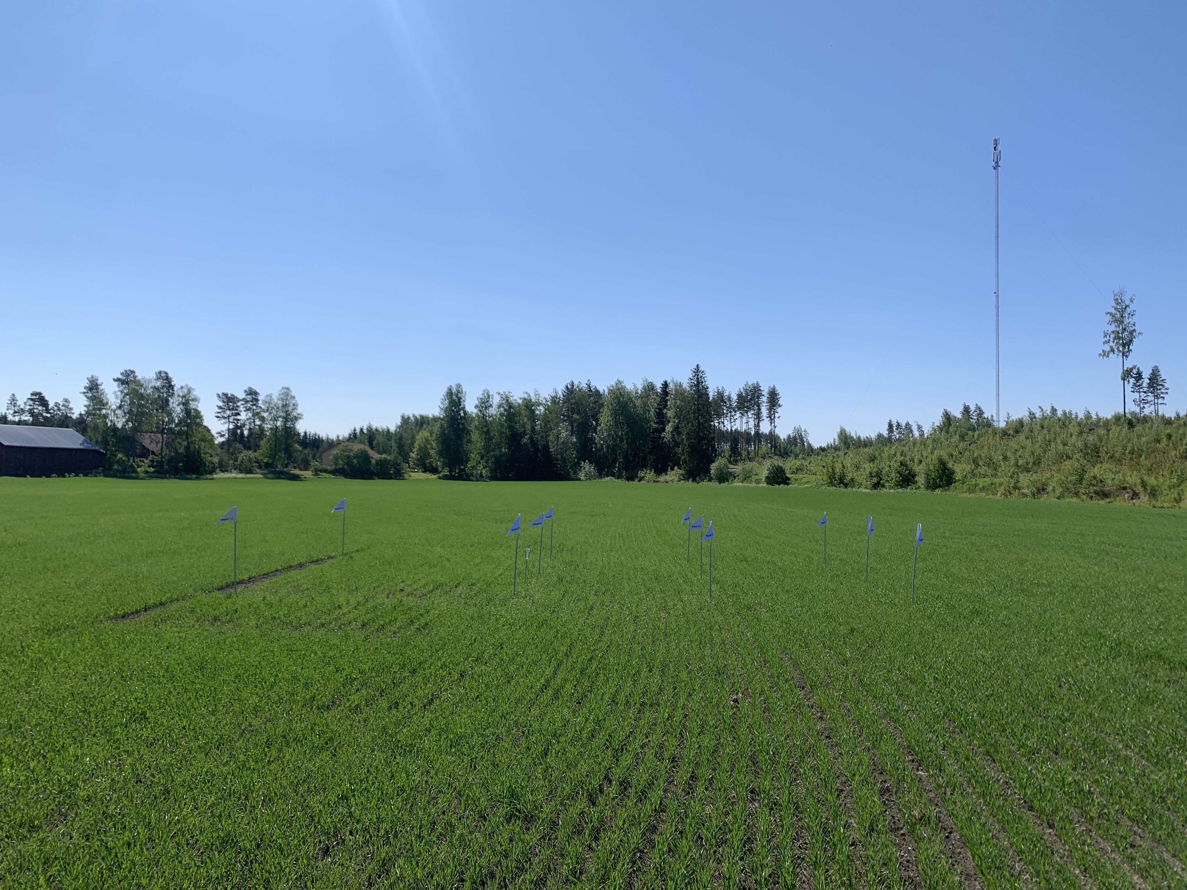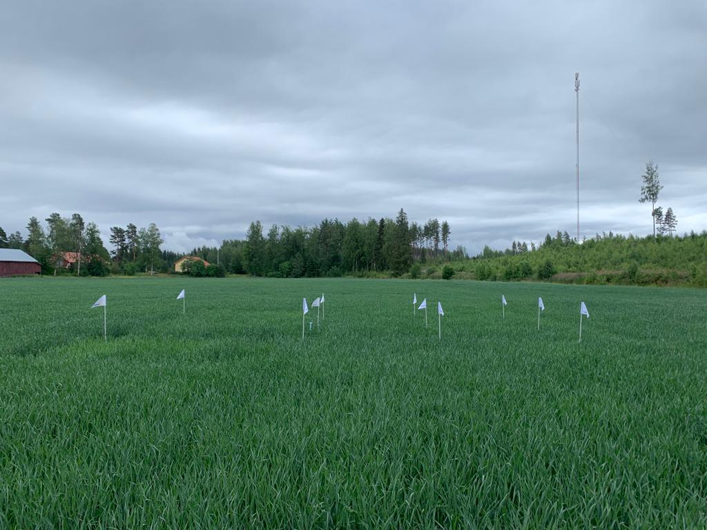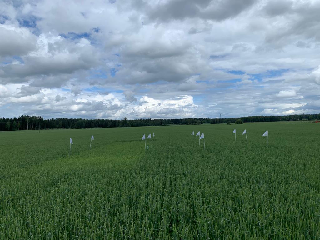 Tammisaaressa odotetaan ja toivotaan vettä. Mittauksen aikana horisontista nousi tummia pilviä ja ukkosen jyrinäkin kuului. Toivottavasti sadepilvet löysivät lohkolle, kun mittaaja ei ehtinyt jäädä tanssimaan sadetanssia kovinkaan pitkään. Kasvusto aivan pensomisen alkuhetkillä. Nollalannoitusruutu lohkolla erottuu selvästi. Kasvuston typenotto on vasta alussa. Kylvöt on täällä suoritettu 14.5. ja kylvölannoituksena on annettu Polar NPK (S) 22-3-10 400kg/ha.