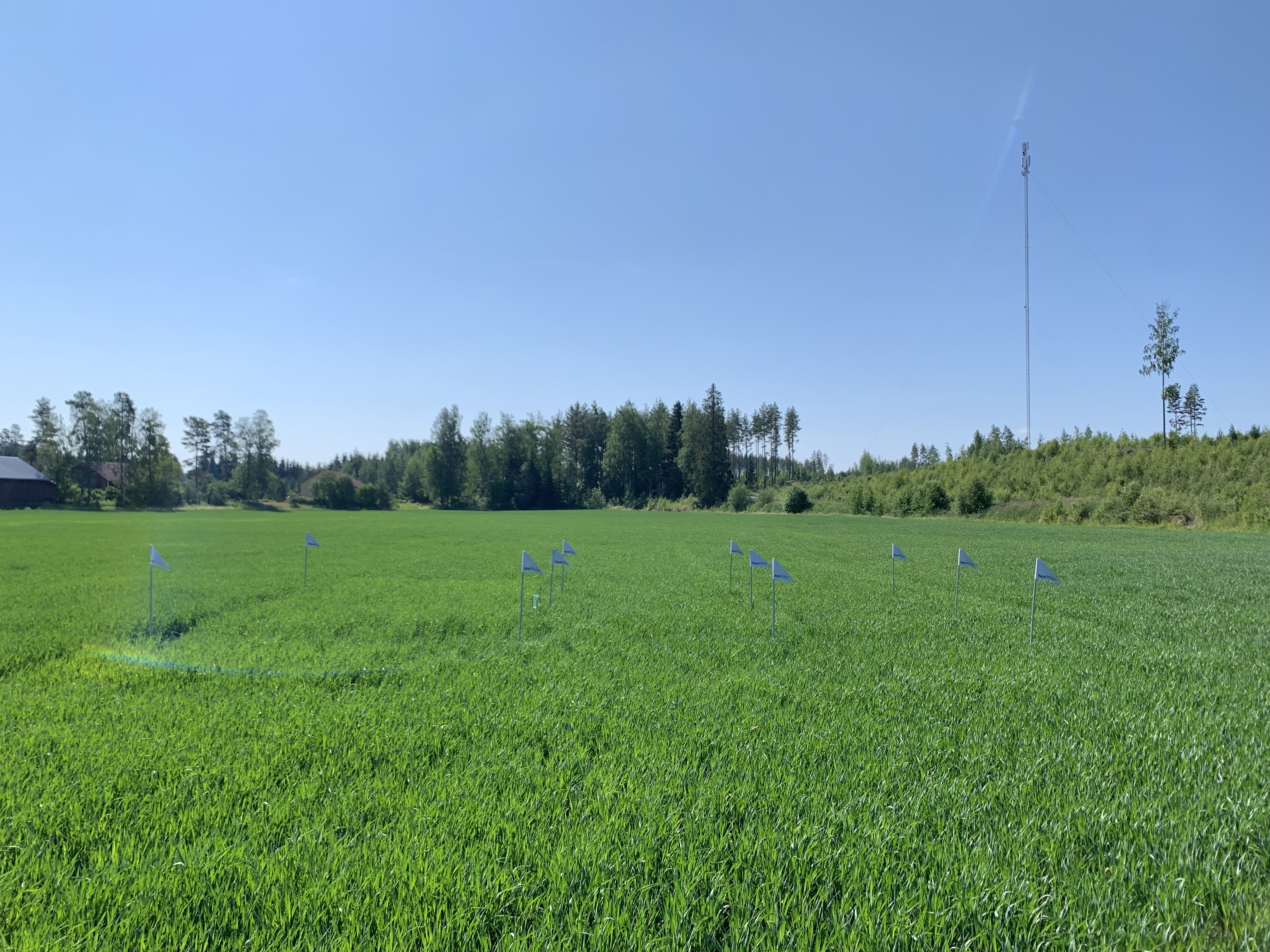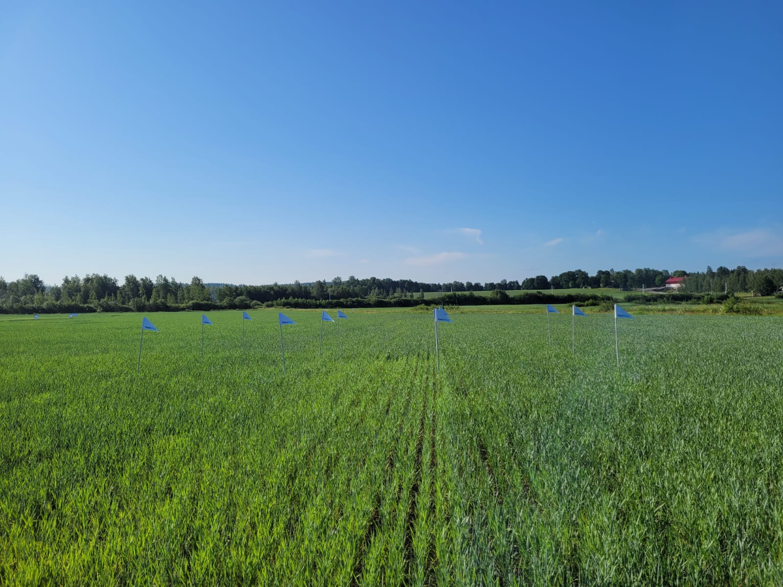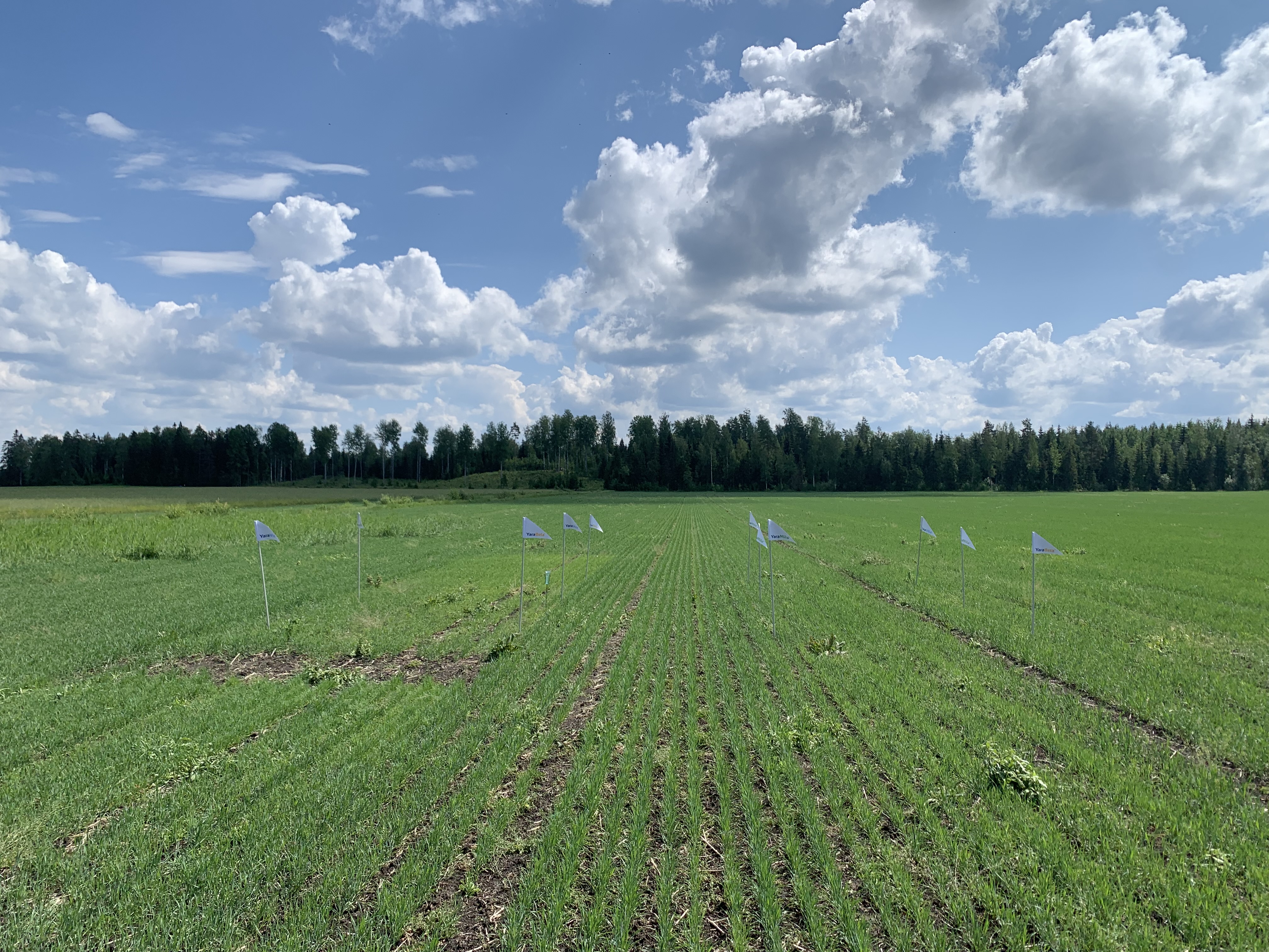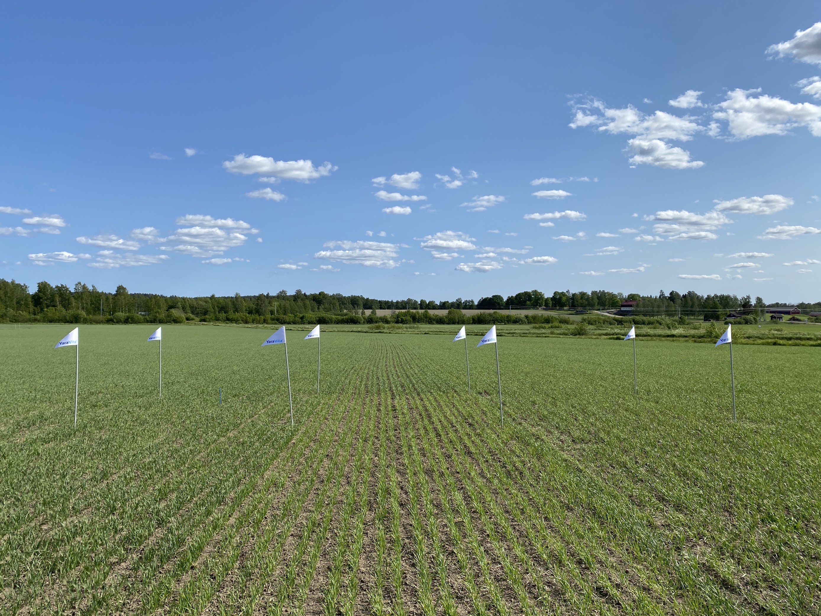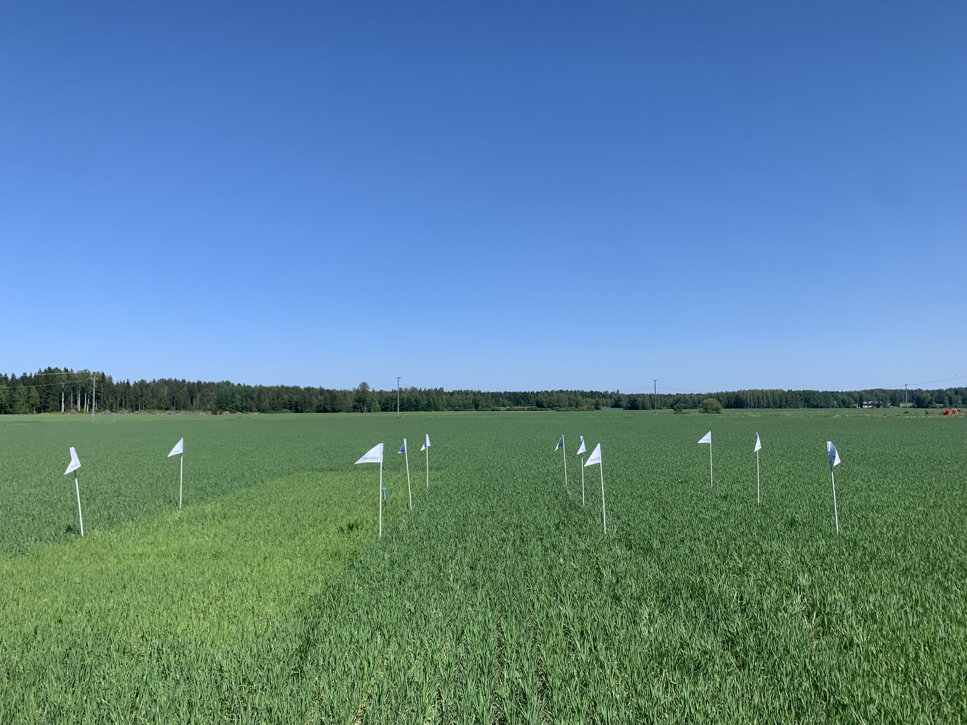 Tammisaaressa odotetaan ja toivotaan vettä. Mittauksen aikana horisontista nousi tummia pilviä ja ukkosen jyrinäkin kuului. Toivottavasti sadepilvet löysivät lohkolle, kun mittaaja ei ehtinyt jäädä tanssimaan sadetanssia kovinkaan pitkään. Kasvusto aivan pensomisen alkuhetkillä. Nollalannoitusruutu lohkolla erottuu selvästi. Kasvuston typenotto on vasta alussa. Kylvöt on täällä suoritettu 14.5. ja kylvölannoituksena on annettu Polar NPK (S) 22-3-10 400kg/ha.