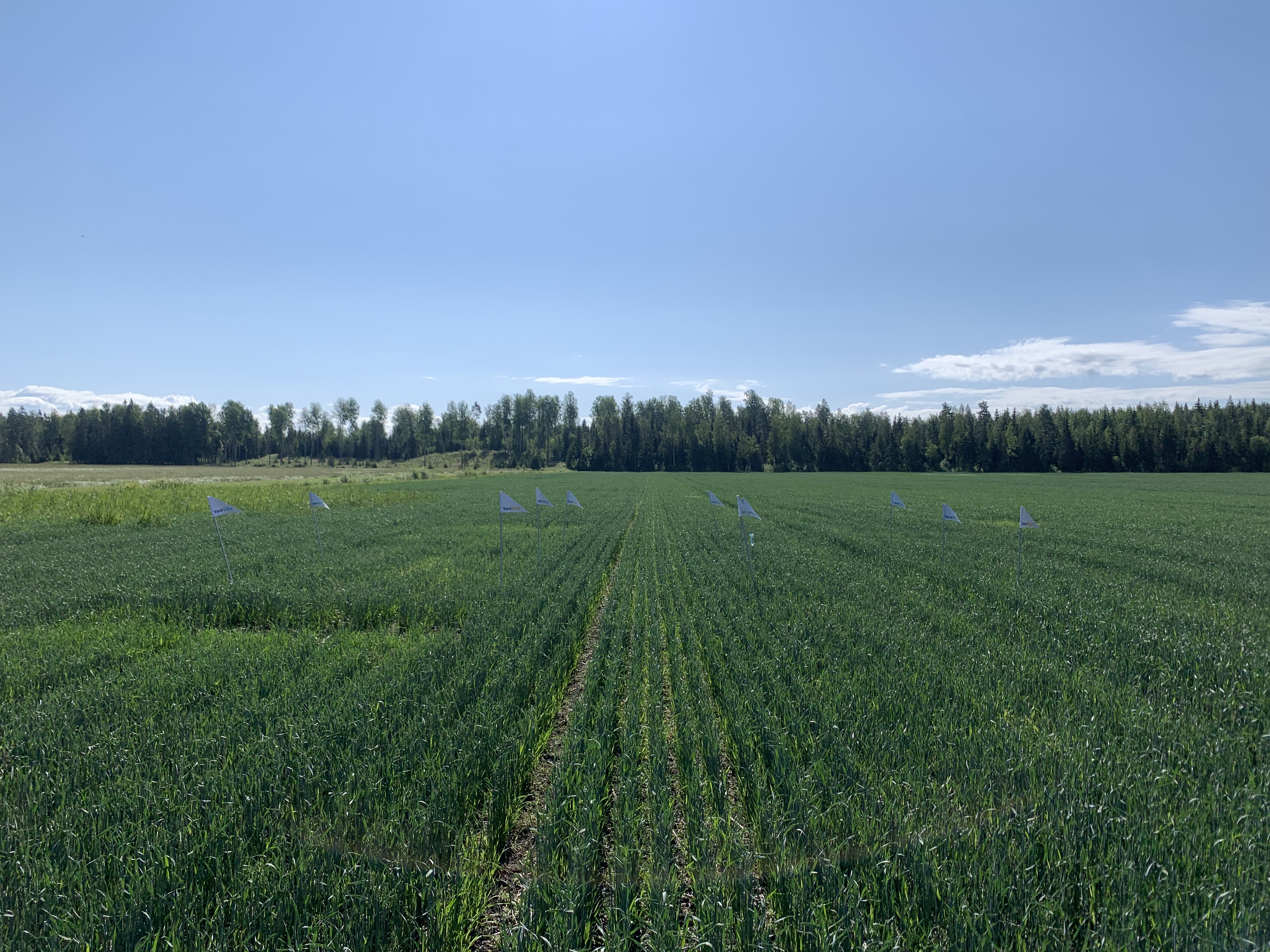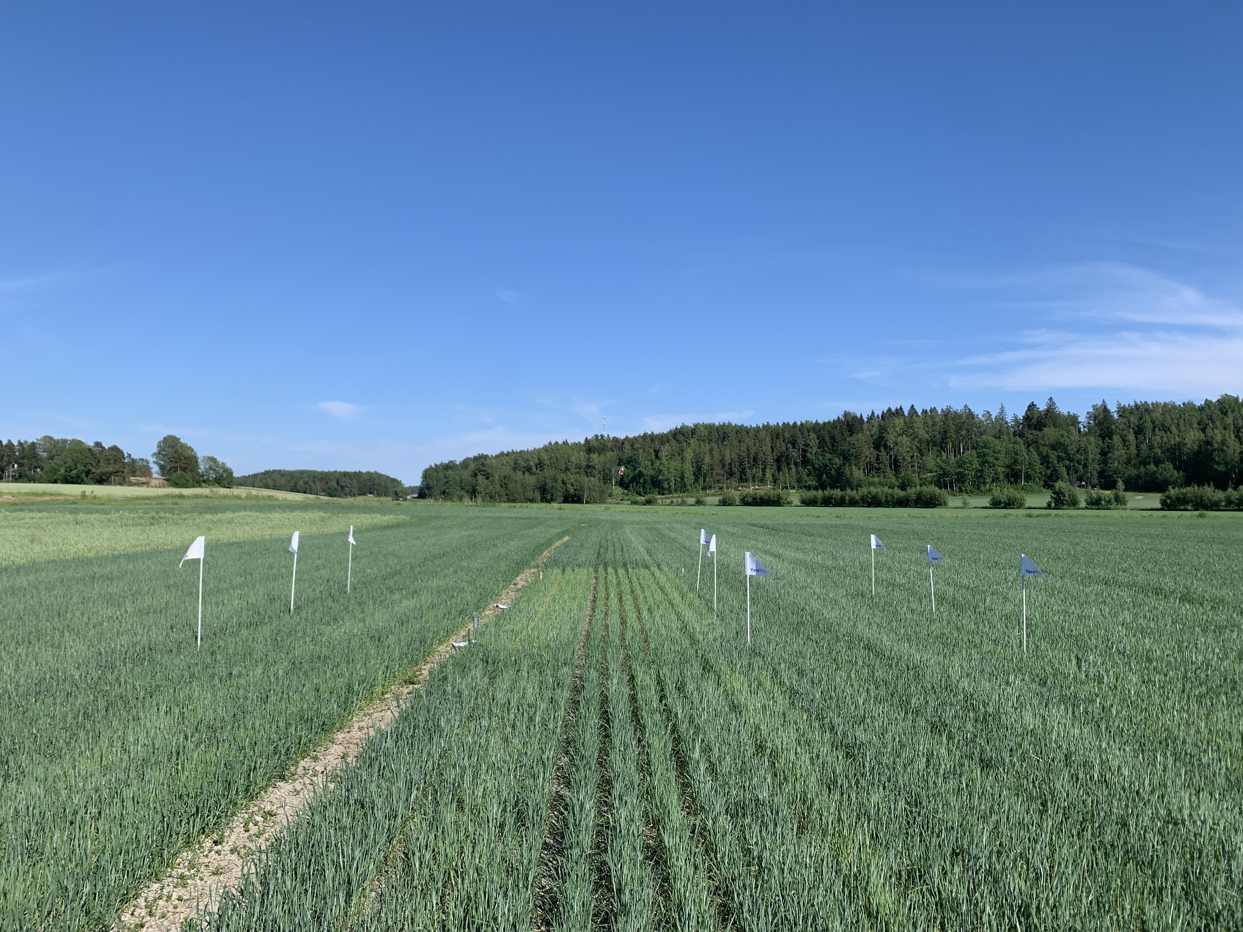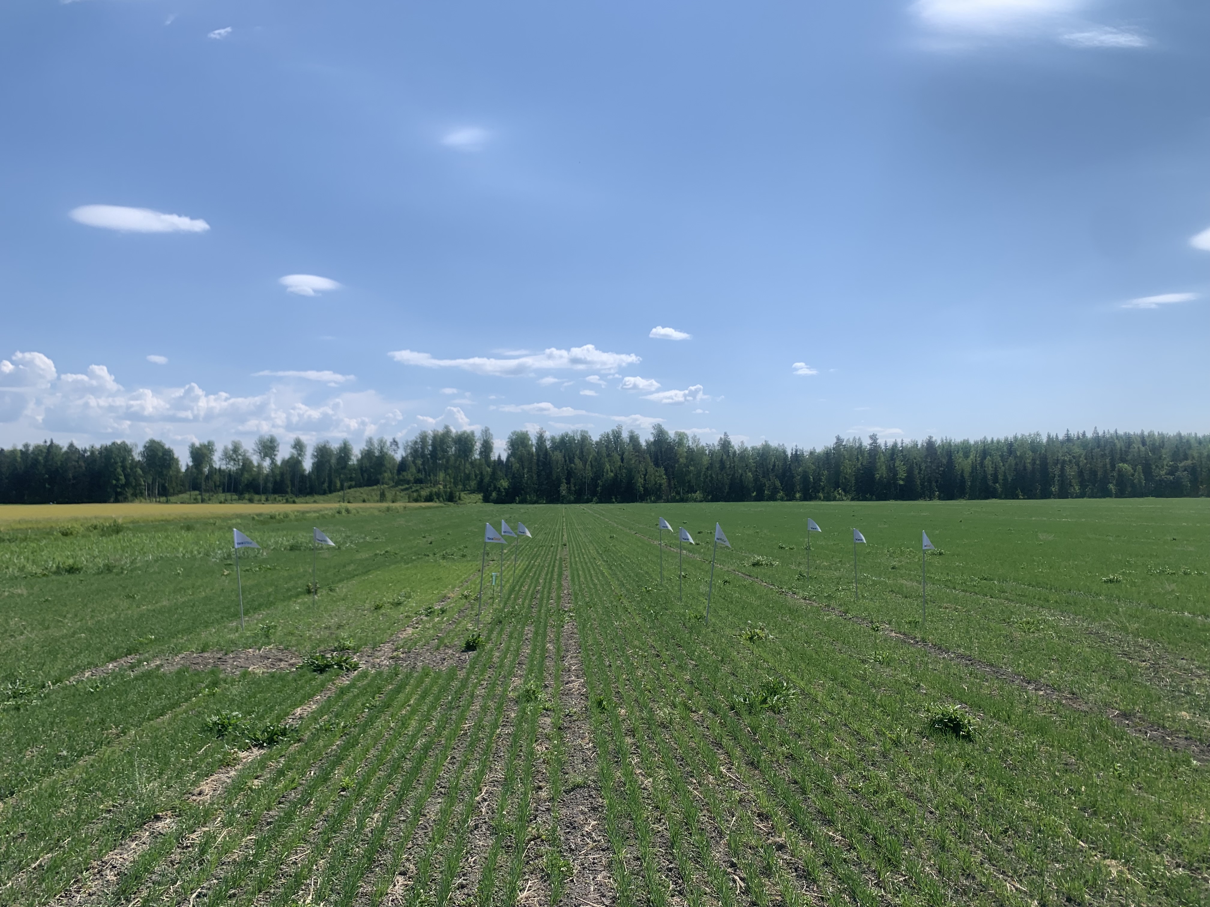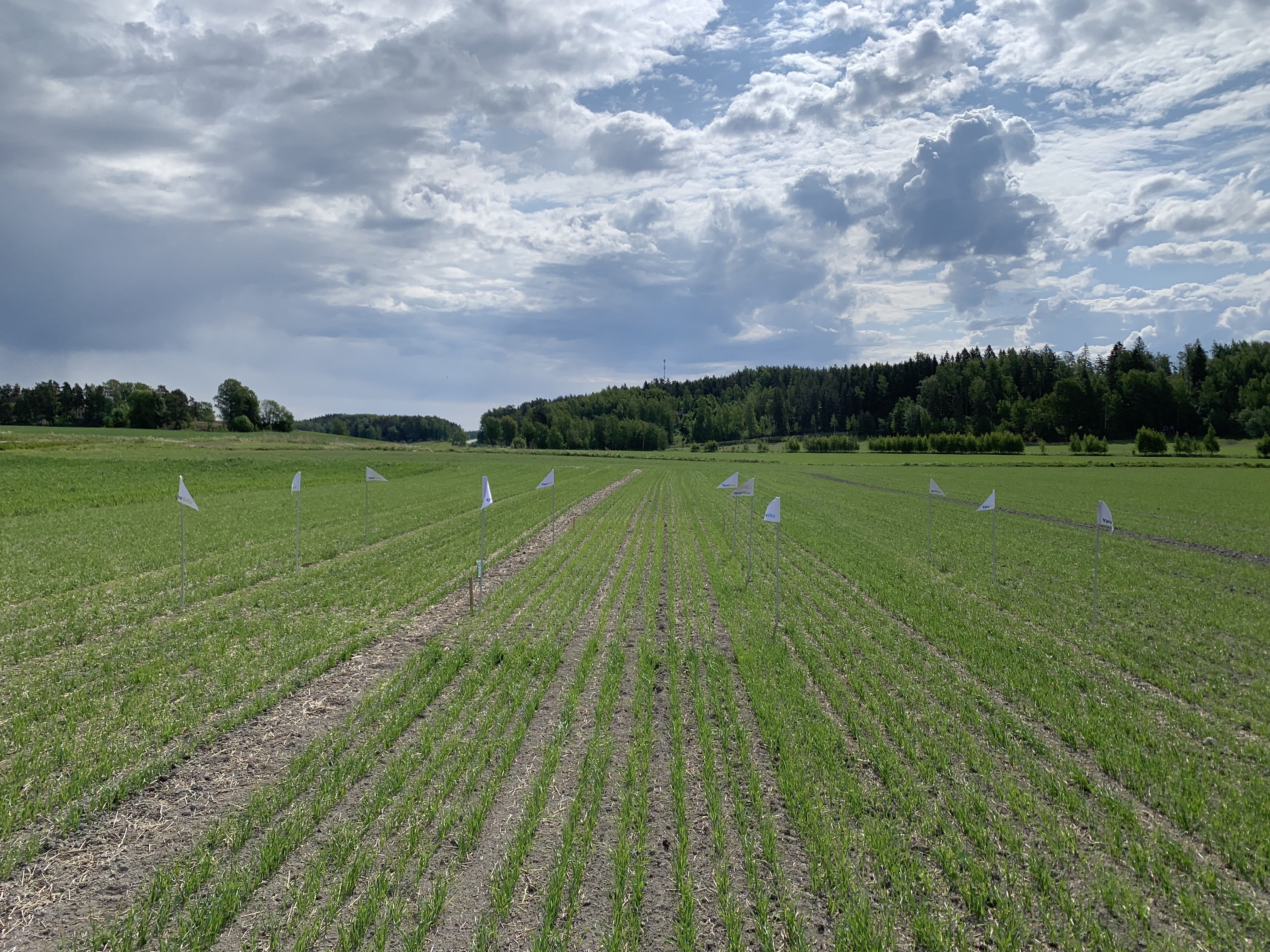 Tammisaaressa odotetaan ja toivotaan vettä. Mittauksen aikana horisontista nousi tummia pilviä ja ukkosen jyrinäkin kuului. Toivottavasti sadepilvet löysivät lohkolle, kun mittaaja ei ehtinyt jäädä tanssimaan sadetanssia kovinkaan pitkään. Kasvusto aivan pensomisen alkuhetkillä. Nollalannoitusruutu lohkolla erottuu selvästi. Kasvuston typenotto on vasta alussa. Kylvöt on täällä suoritettu 14.5. ja kylvölannoituksena on annettu Polar NPK (S) 22-3-10 400kg/ha.