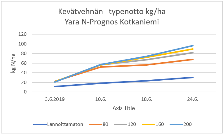 Korkeimman lannoituksen saanut ruutu on sitonut kasvustoon 22 kg typpeä viikon aikana. Eri lannoitustasot ovat alkaneet erottua toisistaan tähkälletulon lähestyessä. Viljan juuristo on suurimmillaan tähkälletulon aikaan, joten kokonaistypenotto voi olla kaksinkertainen maan päältä mitattuun lukuarvoon nähden.