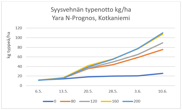 Kotkaniemen syysvehnä otti viime viikon aikana typpeä yli 30 kg/ha. 120 kg typpilannoituksen saaneessa ruudussa kasvu alkoi hidastua verrattuna ylimpiin lannoitustasoihin.