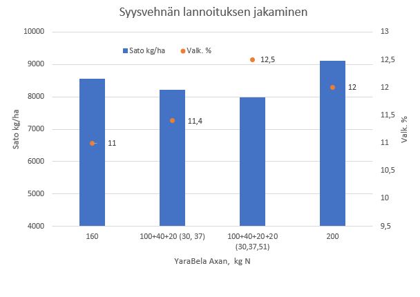 Kertalannoitus 160 kg typpeä/ha keväällä tuotti 8500 kilon hehtaarisadon, mutta valkuainen jäi 11 prosenttiin, eli sato oli rehulaatua.