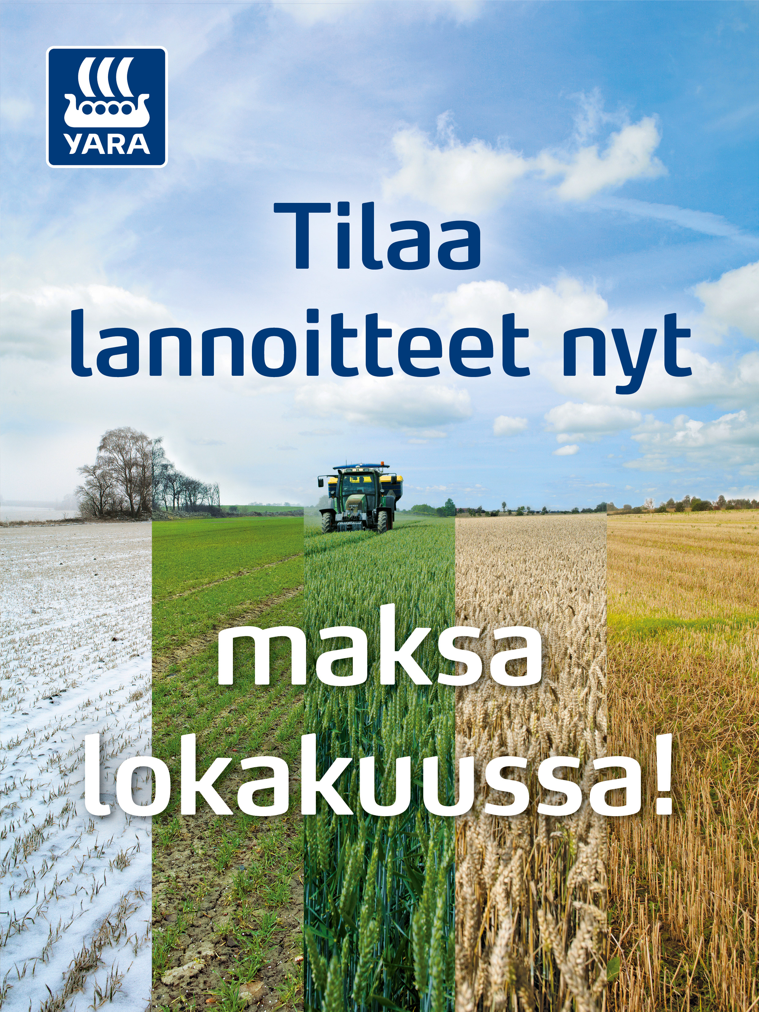 Kun tilaat Yaran lannoitteet viimeistään perjantaina 14. helmikuuta, saat maksuaikaa ensi lokakuuhun saakka. Ole yhteydessä lähimpään maatalousmyyjääsi ja tee kaupat.