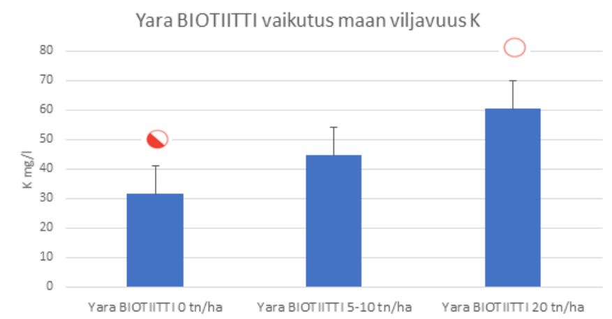 Yara BIOTIITTI lisättiin nurmen perustamisvaiheessa vuonna 2018 (Luke Ruukki 2019-2021). Maan viljavuuskalium määritettiin kolmivuotisen kokeen jälkeen syksyllä 2021. Lähtötilanteessa maan viljavuuskalium oli huononlainen. Yara BIOTIITTI lisäys 20 tn/ha nosti maan viljavuuskaliumin välttävälle tasolle, mutta tällöin nurmirehun kaliumpitoisuus voi kuivina keväinä nousta liian korkeaksi.