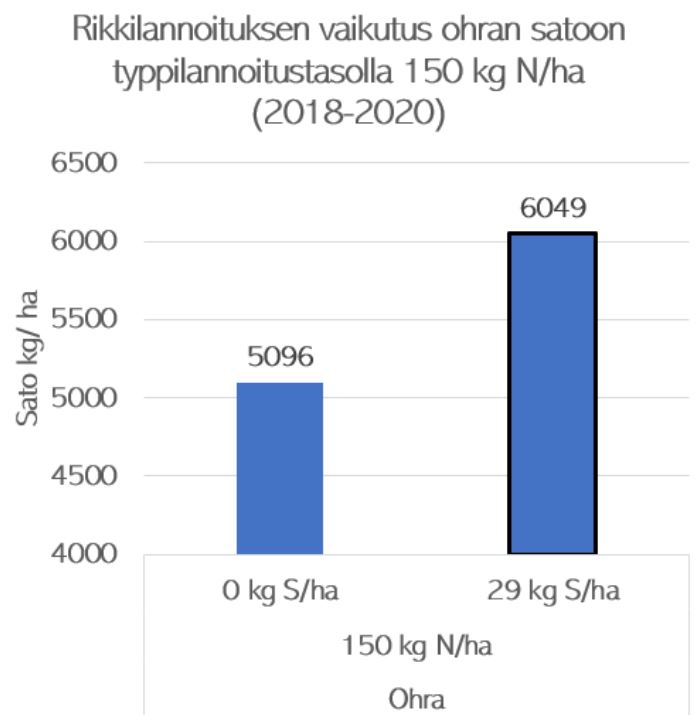 Rikkilannoituskokeissa saadut sadonlisät kertovat rikin merkityksestä. Rikkilannoitus (29 kg rikkiä/ha) nosti ohran satoa 19 prosenttia.