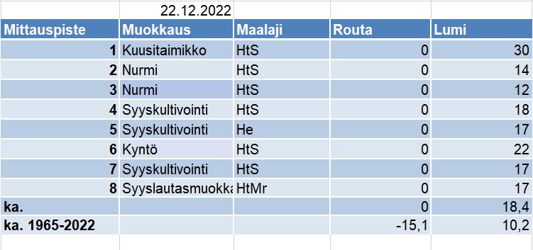 Alla olevasta taulukosta selviää kunkin mittauspaikan routa- ja lumilukemat (cm), eri mittauspaikkojen lukemien keskiarvot (ka.) sekä vuosien 1965-2022 mittausten keskiarvot.