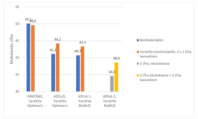 Tässä kokeessa biostimulanteilla näytti olevan paras teho optimia heikommissa kasvuoloissa. Valitettavasti silloin myös lohkon sisällä on usein isoja satovaihteluja. Toisaalta biostimulanttien teho tulisikin näkyä selvimmin vaihtelevissa kasvustoissa.