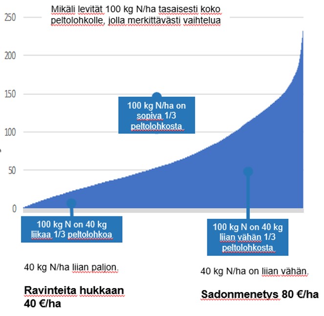 Ajatellaan tilannetta, jossa kolmasosalle peltolohkosta 100 kg N/ha on sopiva lannoitusmäärä keväällä, mutta kolmannekselle se on liikaa tai liian vähän (kuva 1).