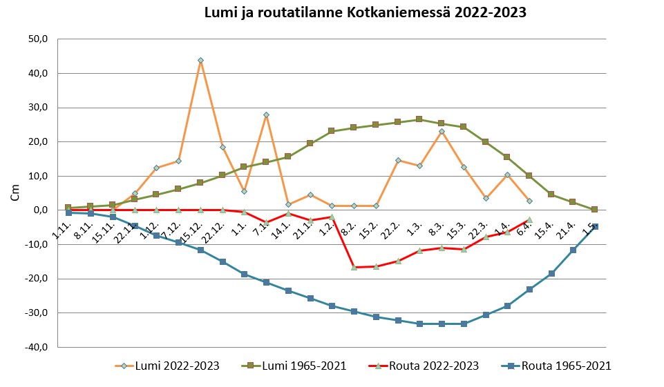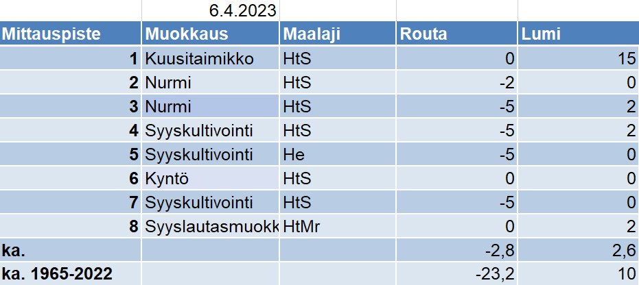 Alla olevasta taulukosta selviää kunkin mittauspaikan routa- ja lumilukemat (cm), eri mittauspaikkojen lukemien keskiarvot (ka.) sekä vuosien 1965-2022 mittausten keskiarvot.