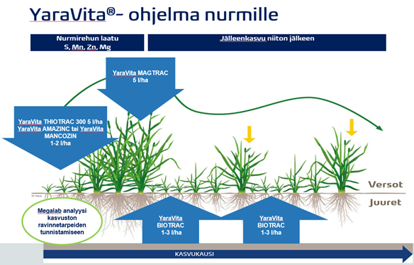 Suurisatoisten nurmien ravinnetarve ei ole kuitenkaan muuttunut ja siksi nurmien ravinnetila kannattaa määrittää kasvukauden alussa lähettämällä nurminäyte Yara Megalab-analyysiin. Yara Megalab-analyysin tulos kertoo sadonmuodostusta rajoittavat ravinteet ja antaa ohjeet sopivan YaraVita-lehtilannoitteen valintaan.