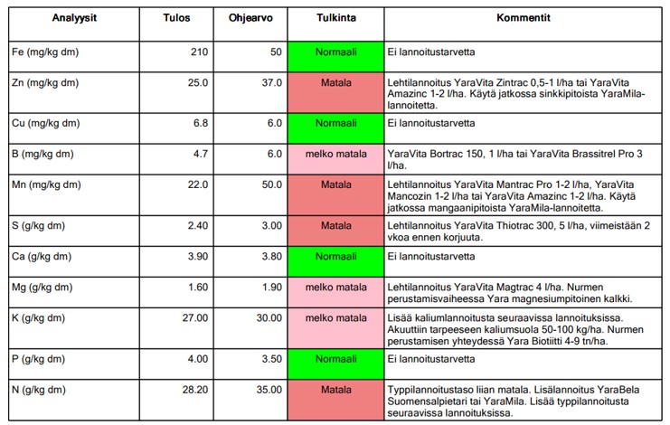 Tulee kuitenkin muistaa, että nurmikasvien pääravinteiden tarve on suuri eikä lehtilannoitteilla pystytä korjaamaan esimerkiksi kaliuminpuutosta vaan tällöin suosituksena on lannoitteen vaihtaminen esimerkiksi YaraMila NK 2-lannoitteeksi tai Yara BIOTIITTI perustamisvaiheessa. Yara Megalab-analyysin tulos antaa siten hyviä ohjeita paitsi ensimmäisen nurmisadon ravinneti-lan parantamiseen, myös ensi vuoden lannoitussuunnitelmiin.