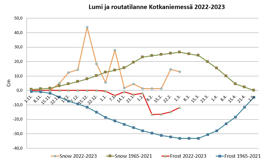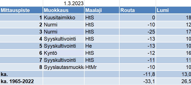 Alla olevasta taulukosta selviää kunkin mittauspaikan routa- ja lumilukemat (cm), eri mittauspaikkojen lukemien keskiarvot (ka.) sekä vuosien 1965-2022 mittausten keskiarvot.