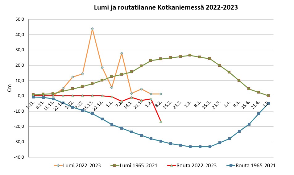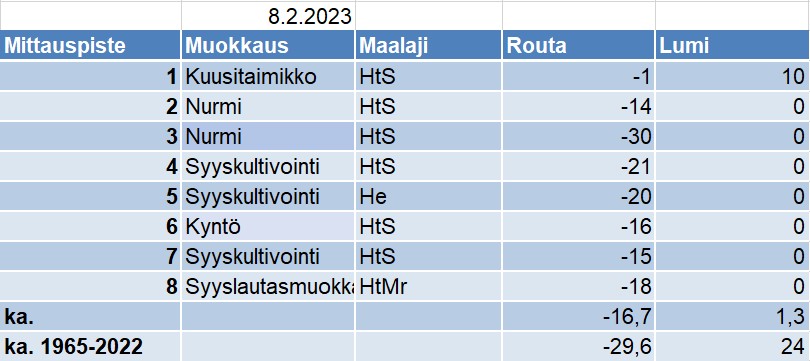Alla olevasta taulukosta selviää kunkin mittauspaikan routa- ja lumilukemat (cm), eri mittauspaikkojen lukemien keskiarvot (ka.) sekä vuosien 1965-2022 mittausten keskiarvot.