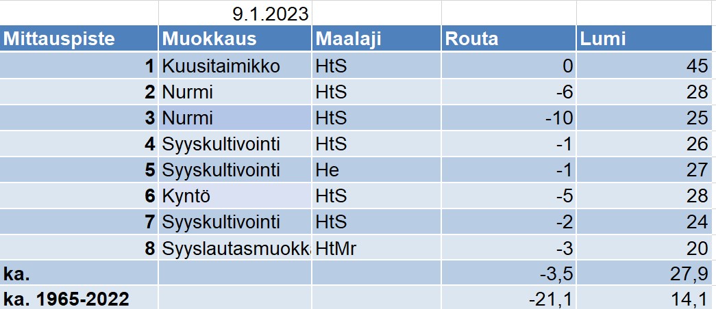 Alla olevasta taulukosta selviää kunkin mittauspaikan routa- ja lumilukemat (cm), eri mittauspaikkojen lukemien keskiarvot (ka.) sekä vuosien 1965-2022 mittausten keskiarvot.