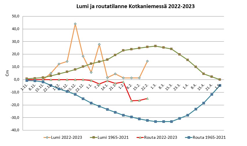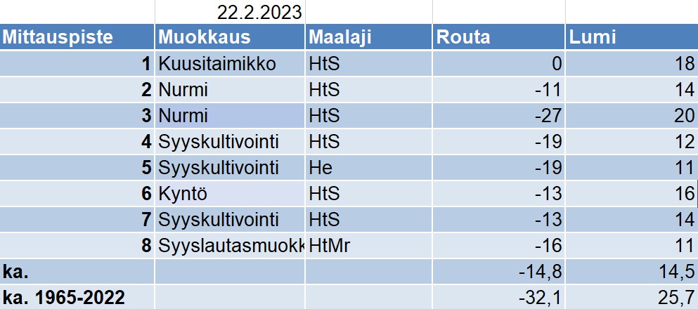 Alla olevasta taulukosta selviää kunkin mittauspaikan routa- ja lumilukemat (cm), eri mittauspaikkojen lukemien keskiarvot (ka.) sekä vuosien 1965-2022 mittausten keskiarvot.